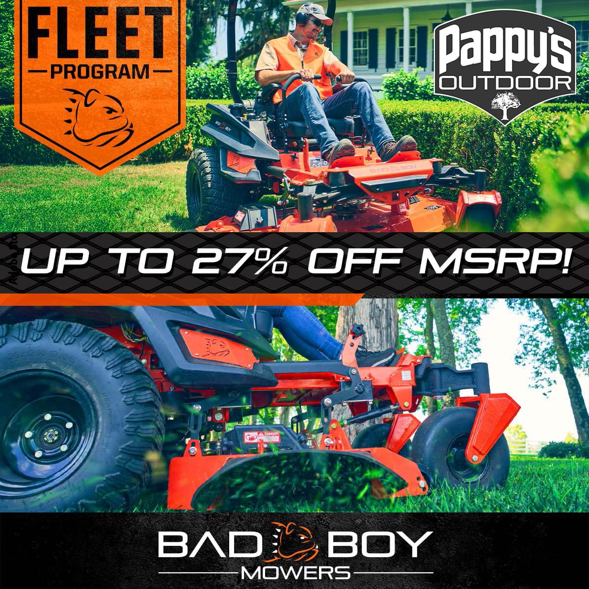 Bad Boy Mowers Fleet Program Savings! Power up your business this spring—buy 2 or more Bad Boy Mowers and save up to 27%! Don’t miss this chance to upgrade your fleet and keep your lawn care ahead of the competition.