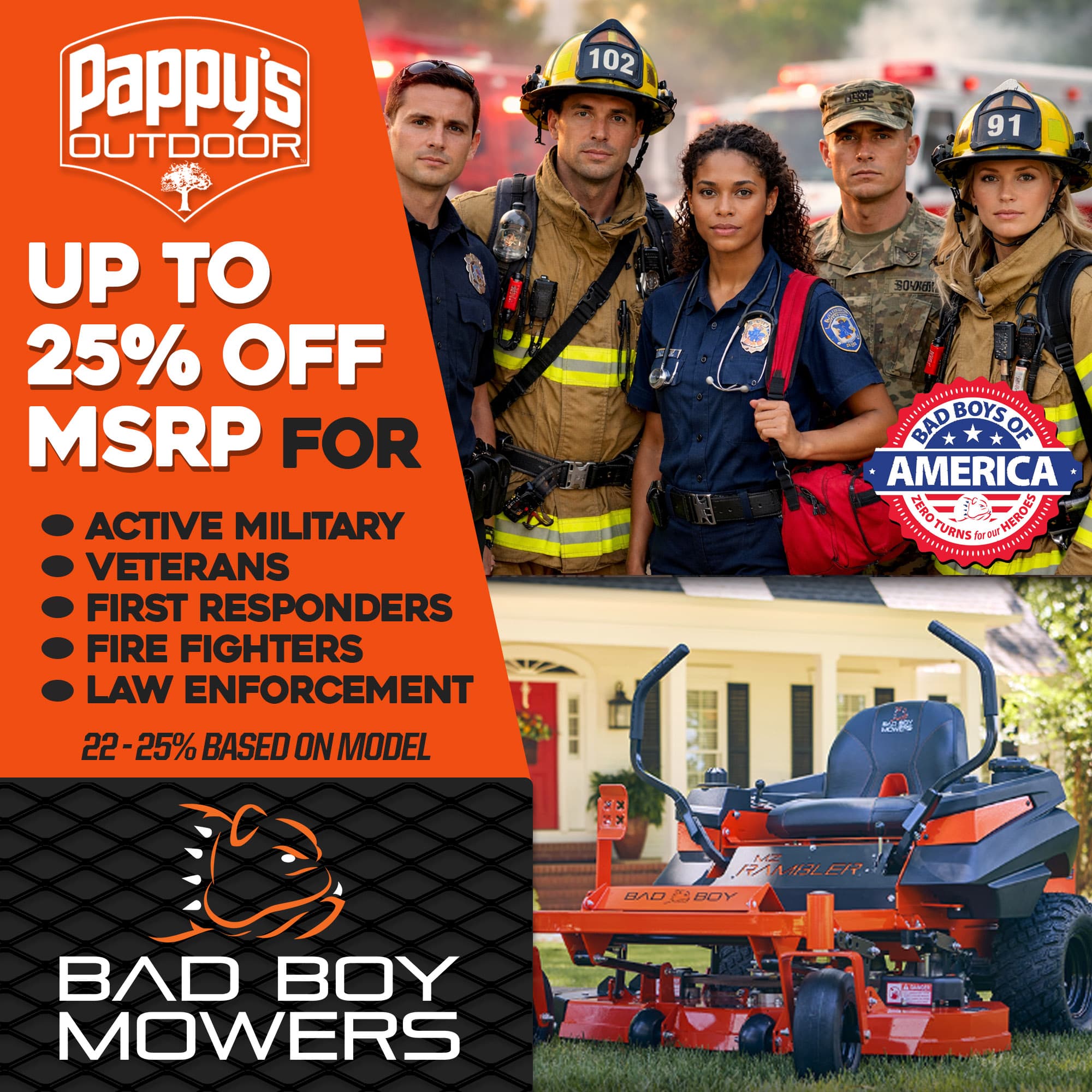 Pappy’s is proud to partner with Bad Boy Mowers for the ‘Zero Turn for our Heroes Program’. Veterans, Active Military, First Responders, Police and Fire personnel can save up to 25% off MSRP on select new Bad Boy zero turn mowers (Discounts are 22-25% based on model).